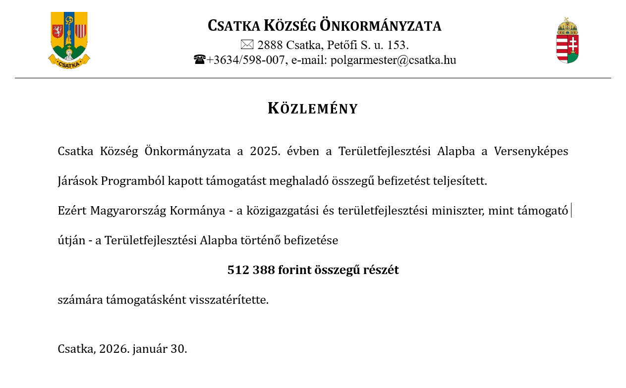 Kedvezményezett: Csatka Község Önkormányzata